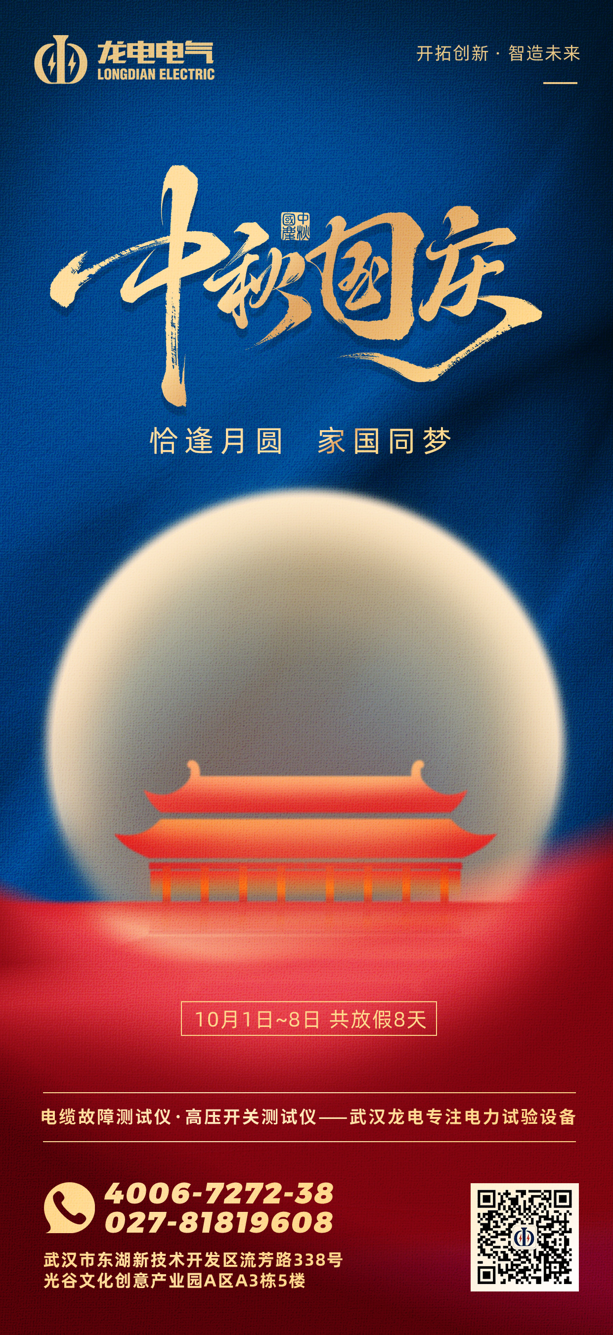 秋色宜人,月圓情濃。值此中華人民共和國成立76周年華誕暨傳統(tǒng)中秋佳節(jié)來臨之際,武漢市龍電電氣設(shè)備有限公司全體員工向您致以最誠摯的節(jié)日問候與祝福!